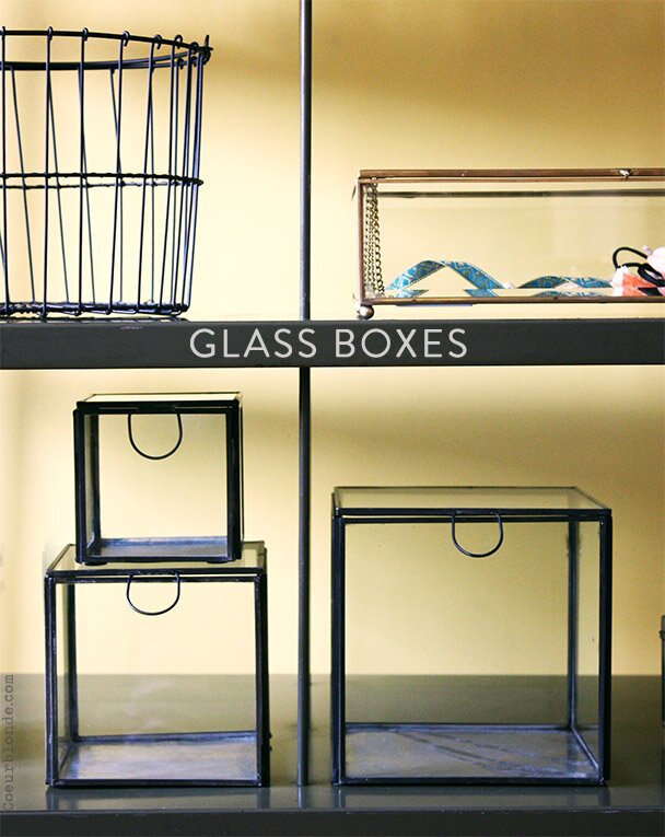 Leuk om kleine en grotere doosjes naast elkaar uit te stallen, zo creëer je een mooi geheel. Schattige set van handgemaakte glazen doosjes van A La. Leuk om kleine sieraden of verzamelobjecten in te bewaren. De laatste tijd zie ik dit soort glazen doosjes in allerlei soorten en maten opduiken, die ontzettend leuk zijn om een mooi item in te presenteren . Eigenlijk zijn het kleine vitrinekastjes van glas waarin je jouw “schatten” kunt.